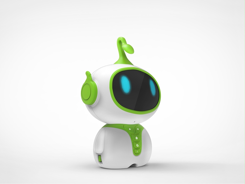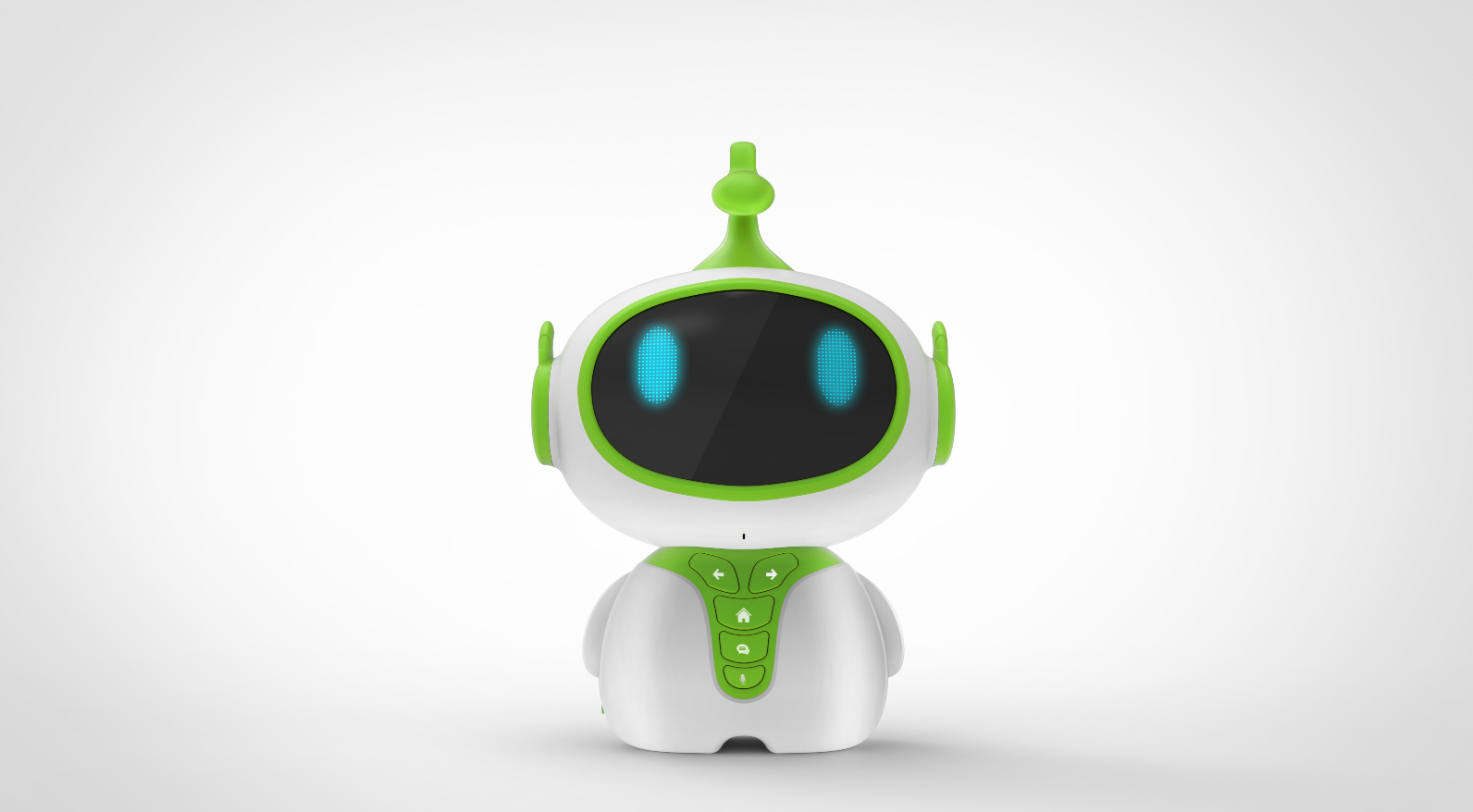 產品整體線條柔和圓潤,大比例的頭身對比,營造出產品呆萌的視覺感受,讓產品在與兒童的交互過程中更具親和力。色彩搭配以幹淨純粹的白色為主,精致細膩的綠色為點綴,讓兒童愛不釋手。